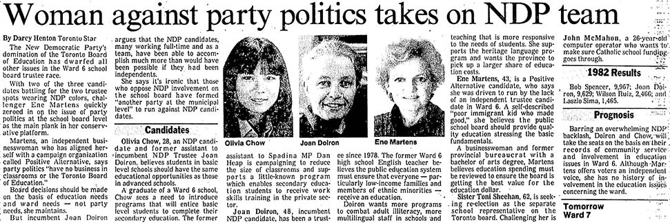 Speaking of Toronto’s new mayor, here’s a profile from the November 2, 1985 Toronto Star of Olivia Chow’s first political race, running for public school board trustee in a downtown Toronto ward. She received the highest vote of any of the three candidates, while the “woman against party politics,” Ene Martens, finished last.