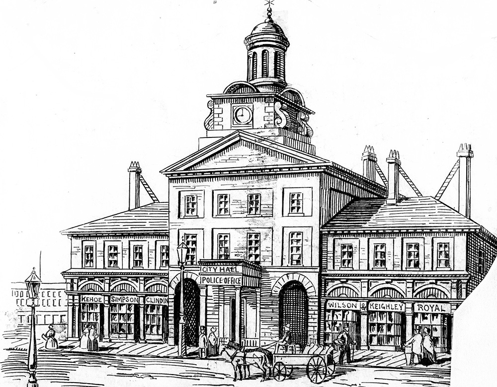 Sketch of Toronto City Hall as it would have appeared around 1856. This building now forms part of St. Lawrence Market's main hall. Illustration credited to C.W. Jefferys. (Toronto Public Library, B1-27C)