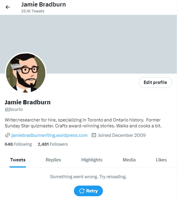 If this is the end of Twitter, it’s time to consider alternatives. I’ve tried Mastodon, but it still feels clunky. As much as I don’t like Facebook and its horrible algorithms, I have launched a professional page where people can keep track of my work. The “Twitter Walks” may become a feature on my Tales of Toronto site or appear on Instagram. I might even revive the blog I started 20 years which has hibernated in recent years. I may miss the instant ability to post and react, but taking time to craft posts on other platforms may be better in the long run. Any suggestions are appreciated.